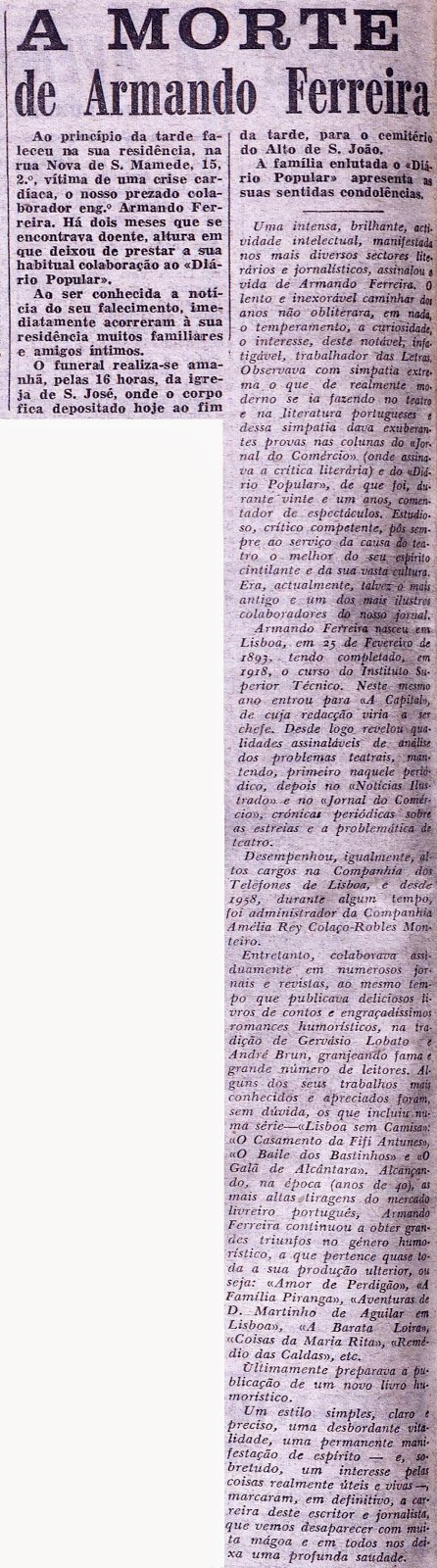A Baratinha Loira. No seu obituário, nas peças noticiosas aqui impressas, indica-se que os textos dele alcançariam tiragens elevadas para o nosso mercado durante a década de 1940. A colaboração de Armando Ferreira estendeu-se ainda pelos júris dos concurso de peças de teatro patrocinado pelo SNI. Foi sócio fundador da Sociedade de Autores e Compositores Portugueses.