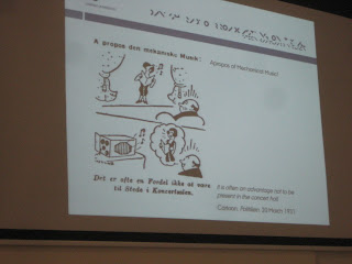Já Steen Kaargaard Nielsen, a trabalhar na edição de um livro sobre a matéria da querela em 1931 entre música ao vivo e música gravada, que o diapositivo abaixo (cartune) ilustra, tem igual paralelo na vida cultural portuguesa, o que indica que as realidades sociais e tecnológicas não andam distantes de país para país. Steen Nielsen desenvolveu uma ideia de som natural e de som metálico, de efemeridade da emissão radiofónica - e da sua imaterialidade, acrescento. Claro que a música ao vivo atingia poucas pessoas e identificadas com um estatuto social mais elevado, ao passo que a música gravada, a partir do momento da massificação e baixa de preços dos discos e dos dispositivos mediados da música, tornou-se uma espécie de propriedade do povo. O autor referiu ainda a importância dos jovens na renovação musical, pelo que falou de movimentos juvenis. Uma última nota: na Dinamarca, fala-se mais de música de ritmo do que música popular.