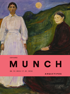 Edvard Munch. Arquetipos (Museo Thyssen-Bornemisza). Muitas das obras provêm do museu de Oslo. Os temas são estados anímicos (melancolia, paixão, submissão) e obsessões existenciais (amor e ódio, desejo, ansiedade e morte). No primeiro tema, talvez o que mais me tenha chamado a atenção. As mulheres do campo mas junto à costa olham desencantadas ou sem esperança, repetindo formas em gerações diferentes. Mãe e filha têm a mesma postura de corpo, já conformadas com o destino, a pobreza e as condições duras da vida. Há cenas de uma povoação interior, com a sua pobreza e finitude de valores. Não sei se há alguma solidariedade entre as personagens. Munch retoma temas trabalhados quase trinta anos depois, como a doença da menina, experimentando ainda diversos materiais: folha de cobre (para impressão), litografia, tela com óleo. As salas do amor e do ódio são as mais significativas dos trabalhos presentes. A um conjunto pequeno de peças que representam o beijo (a lembrar também Klimt), no resto do tema o homem é apresentado como o sexo fraco. A mulher aparece como o vampiro, que morde e assassina o homem. Vê-se isso em cenas em que a mulher, de pé, contempla o cadáver do homem deitado na cama. Já nos quadros iniciais da povoação rural, as formas que se tornariam célebres em