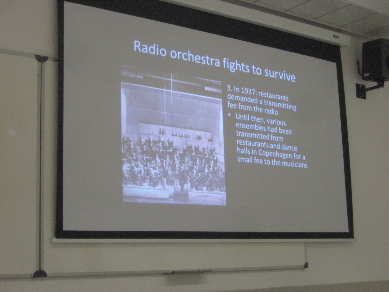 Anja Lindelof destacou o papel da orquestra sinfónica (orquestra de câmara) da rádio pública dinamarquesa, nascida em 1925 e desaparecida em 2014. No diapositivo abaixo, ela falaria das lutas de sobrevivência da orquestra. Primeiro, a atual modernidade da rádio implica o desaparecimento de um modelo com quase cem anos. Se a transmissão para restaurantes, por exemplo, pedida em 1937, perdeu total significado, ou o registo de discos pela estação de rádio foi abandonado pela atividade privada, o conceito de orquestra sinfónica representa uma mentalidade em termos de produção presente. Curioso em 1949 a separação entre rádio clássica e rádio de música ligeira, pelas semelhanças com a ação da nossa Emissora Nacional de Radiodifusão. A recente luta pela sobrevivência passou pelos patrocínios, pela criação de uma marca e por festas, como se se tratasse de uma banda que tem contactos massificados nos concertos. A autora teve tempo ainda para refletir na idade de ouro da música de câmara na rádio e na distinção entre alta e baixa cultura. O trabalho de Anja Lindelof inspirou-me a traçar uma linha na investigação que não imaginava existir.