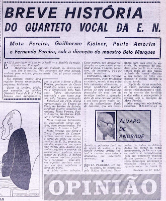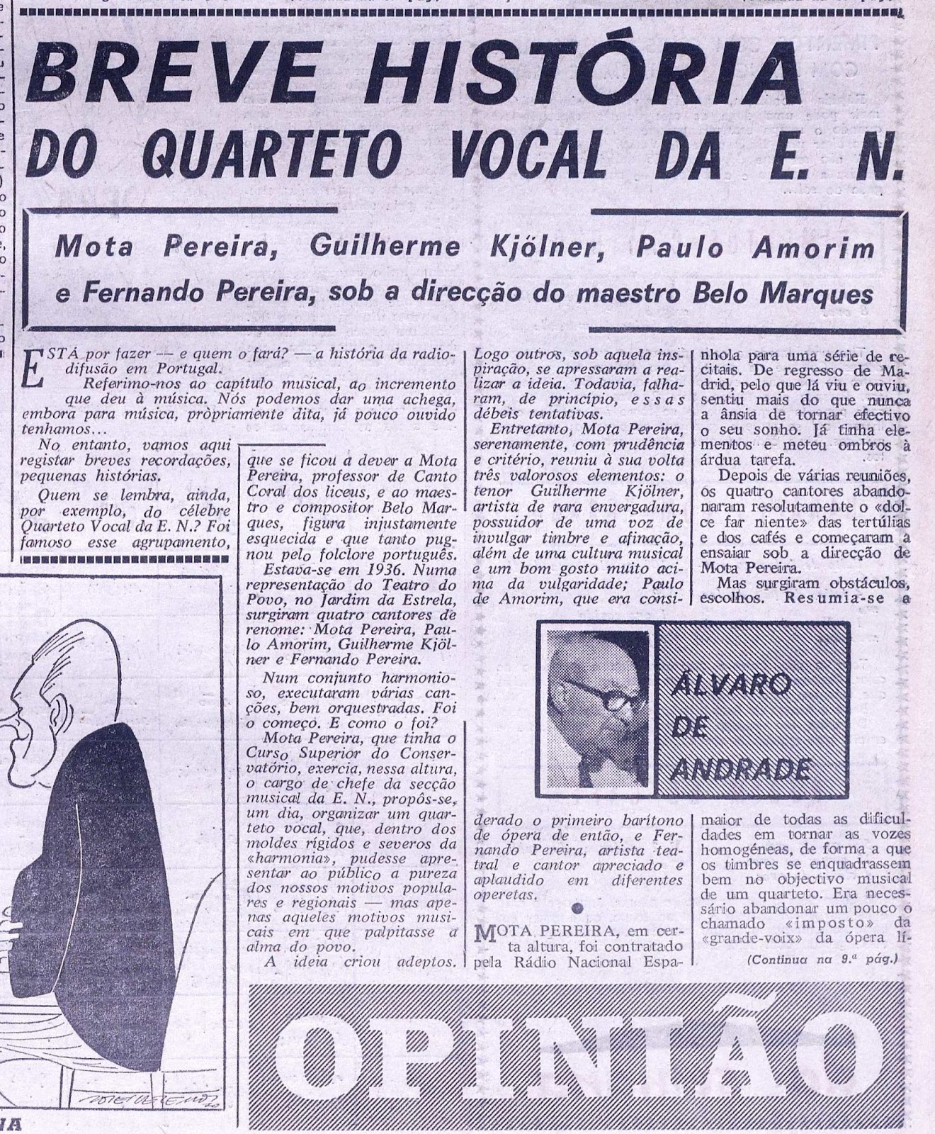 Diário Popular, de 18 de agosto de 1970, Álvaro de Andrade escreveu sobre o Quarteto Vocal da Emissora Nacional, recordando a composição do grupo e suas histórias desde 1947. Ele incluía Mota Pereira (baixo, professor liceal e profissional da Emissora), tenor Guilherme Kjölner, barítono Paulo Amorim e Fernando Pereira, popular cantor de opereta, sob a direção do maestro Belo Marques. Mota Pereira, depois de atuar em recitais na Rádio Nacional de Espanha, trouxe a ideia e pô-la em prática.