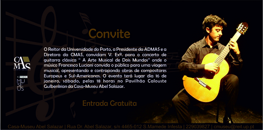 Concerto de Guitarra Francesco Luciani, dia 16, sábado, pelas 18:00, Casa-Museu Abel Salazar (S. Mamede de Infesta, Matosinhos)?.