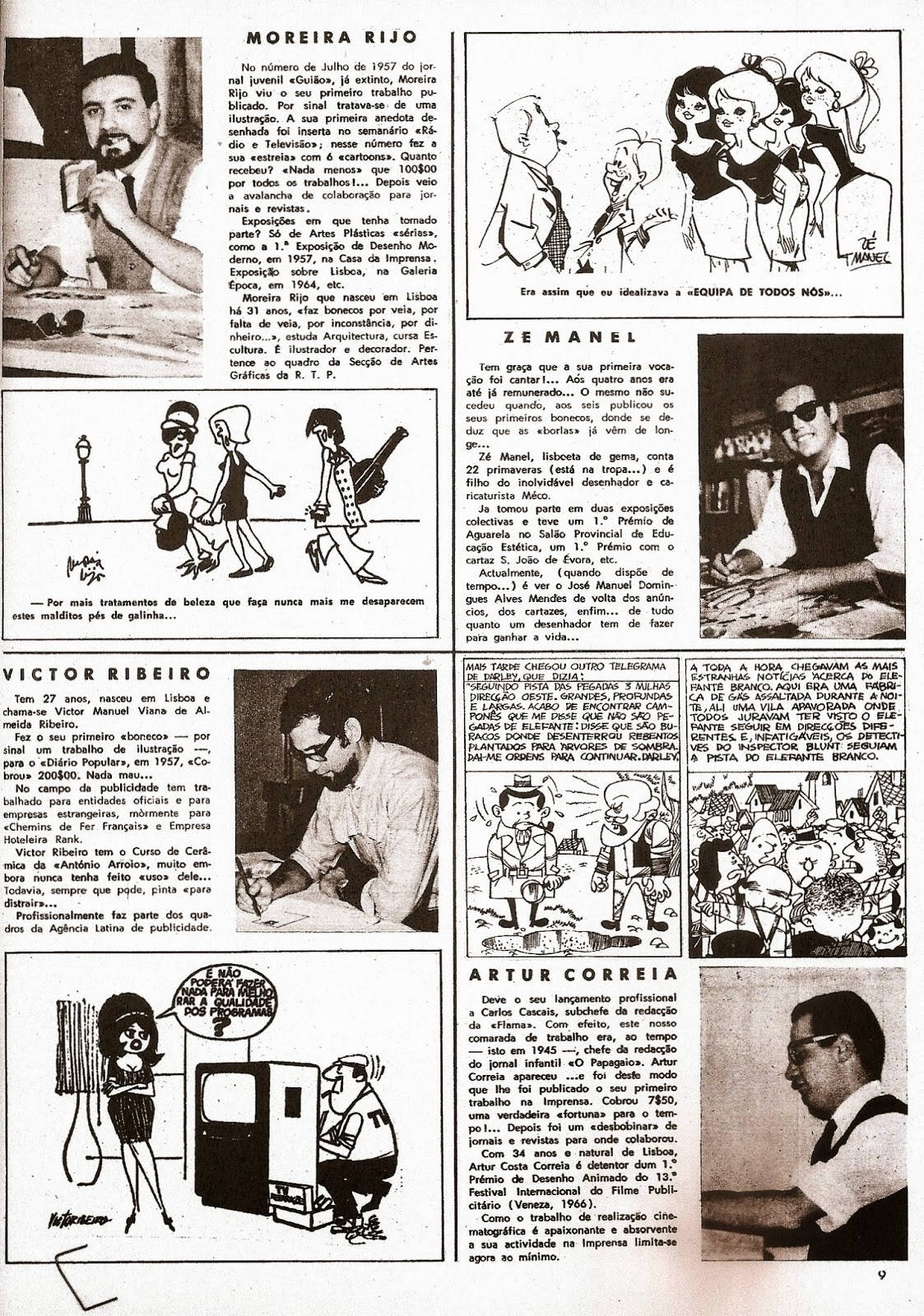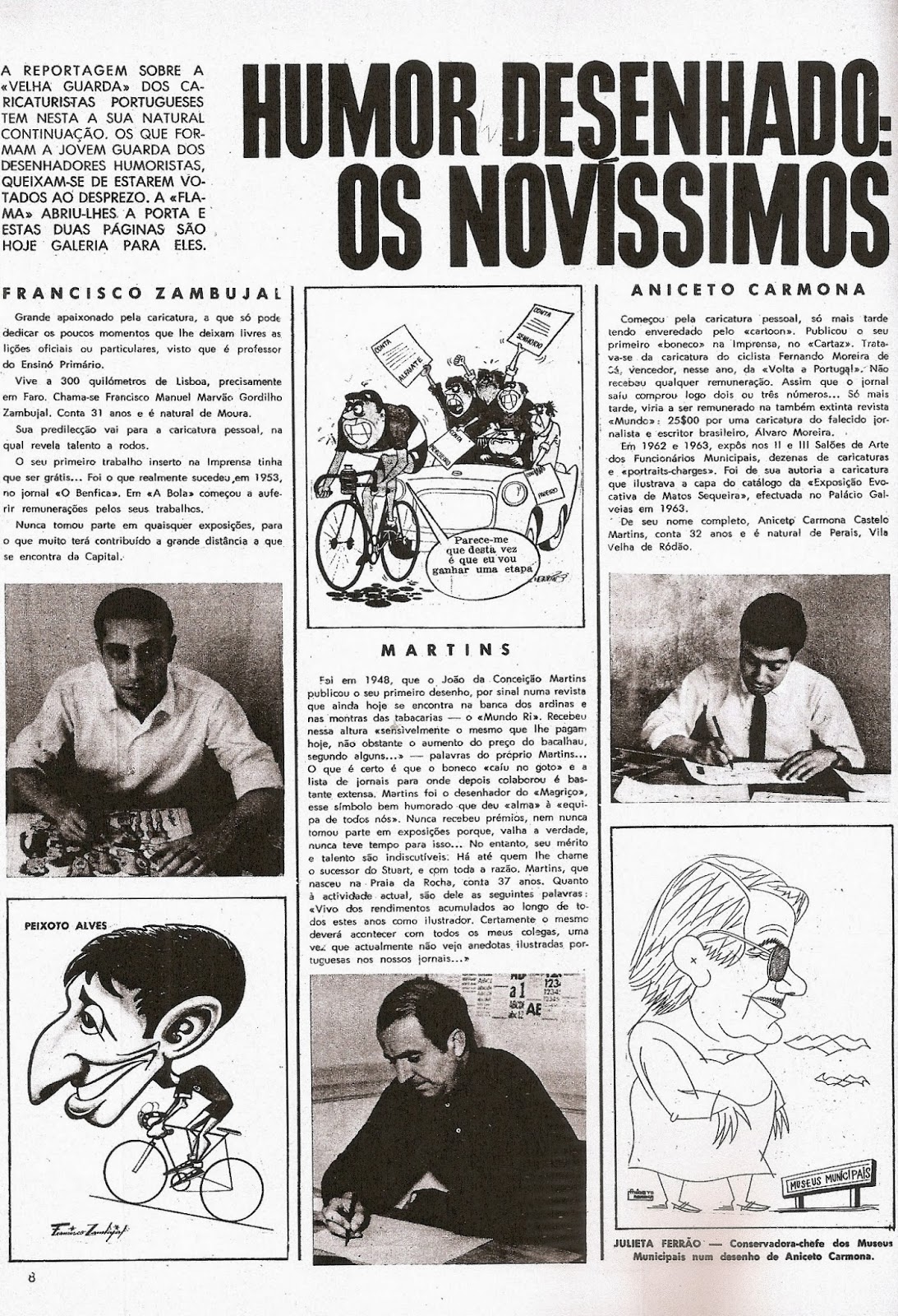 Flama durante a década de 1950 e começos da década seguinte. Não encontrei pistas até aparecerem estes dois textos na revista em números seguidos (12 de Agosto e 9 de Setembro de 1966), assinados por Aniceto Carmona, um dos "novíssimos" artistas. Nestes aparecem duas gerações de caricaturistas ou desenhadores humoristas, a mais antiga e a mais nova. Todos aparecem nas fotografias de caneta sobre a prancheta assente numa mesa de trabalho, muitos ainda vestindo gravata e atentos ao seu trabalho. Figuras do tempo, personagens inventadas pelos caricaturistas e cenas de acontecimentos são os três tópicos que elenco a partir dos trabalhos expostos. Fico informado de condições de trabalho, remunerações e jornais ou revistas por onde se estende a actividade destes criativos. Por vezes, este trabalho é de tempos livres pois os artistas têm profissões distintas.