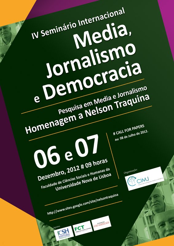 <div class="separator" style="clear: both; text-align: center;"><a href="https://1.bp.blogspot.com/-lTBMeiTCRSs/T5Z8zKNjkiI/AAAAAAAAMJM/cwH2rtqlWT4/s1600/NT.jpg" imageanchor="1" style="clear: left; cssfloat: left; float: left; margin-bottom: 1em; margin-right: 1em;"><img border="0" height="400px" oda="true" src="https://1.bp.blogspot.com/-lTBMeiTCRSs/T5Z8zKNjkiI/AAAAAAAAMJM/cwH2rtqlWT4/s400/NT.jpg" width="282px" /></a></div>O IV Seminário Internacional Media, Jornalismo e Democracia, organizado pelo Centro de Investigação Media e Jornalismo (CIMJ), realiza-se nos dias 6 e 7 de dezembro de 2012, na Faculdade de Ciências Sociais e Humanas da Universidade Nova de Lisboa (Avenida de Berna, 26C - Lisboa).<br /><br />O seminário tem por tema <em>Pesquisa em Media e Jornalismo</em> e será dedicado a homenagear o principal dinamizador dos Estudos Jornalísticos em Portugal nos últimos trinta anos, o Professor Nelson Traquina, anterior presidente da direção do CIMJ.<br /><br />O programa integra sessões plenárias e sessões paralelas para comunicações de tema livre relacionadas com os media e do jornalismo, que serão sujeitas a um processo de dupla arbitragem científica (<a href="https://sites.google.com/site/nelsontraquina/programa">https://sites.google.com/site/nelsontraquina/programa</a>). Para submissão de comunicações, deverá consultar as normas definidas na chamada de trabalhos (email: <a ,="" cimjmedia@gmail.com="" href="mailto:homenagemnelsontraquina@gmail.com">homenagemnelsontraquina@gmail.com</a>, <a href="mailto:cimjmedia@gmail.com">cimjmedia@gmail.com</a>).<br /><br />O prazo para submissão de propostas de comunicação (envio de resumo) termina a 8 de julho de 2012. As propostas de comunicação selecionadas serão divulgadas neste website, provavelmente até dia 15 de julho de 2012. As línguas oficiais do congresso são o português, o galego, o espanhol e o inglês.